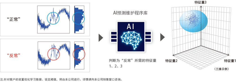 根据目标机构的运行数据,将判断为“反常”所需的特征量转化为软件部件,作为AI预测维护程序库。可轻松开启预测维护工作。