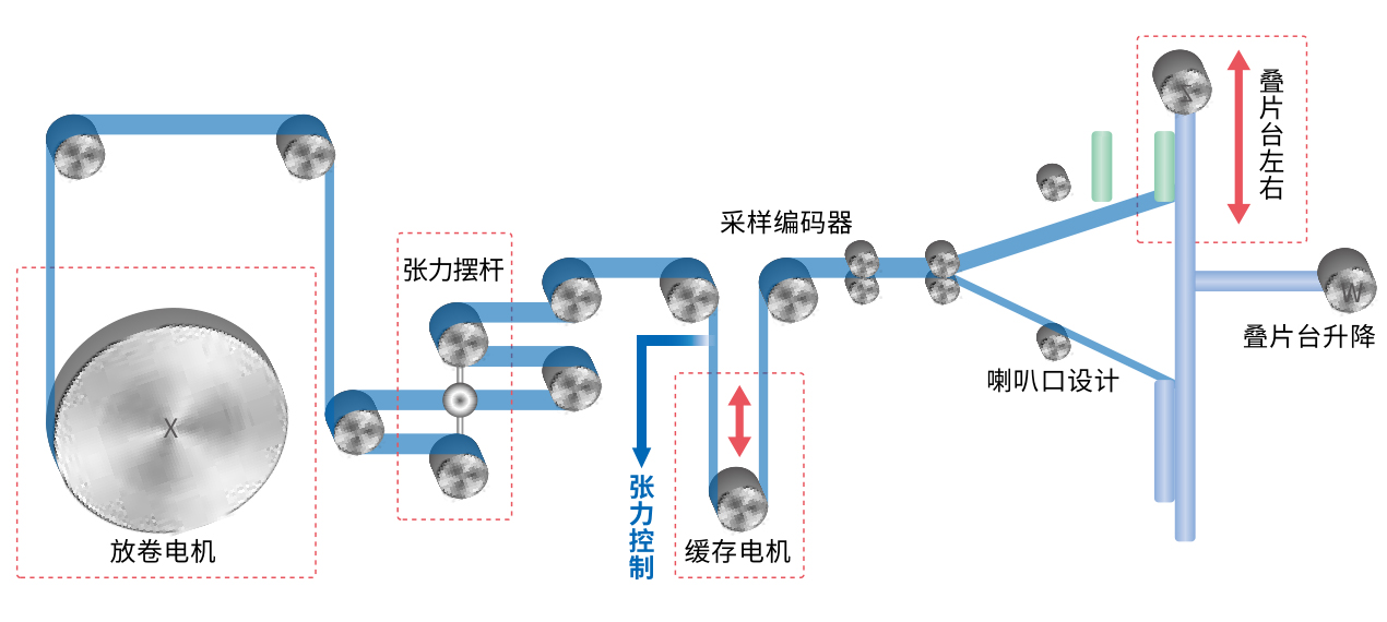 通过算法控制叠台移动与隔膜缓存运动,从而有效提高同步性,实现张力控制,降低张力波动。