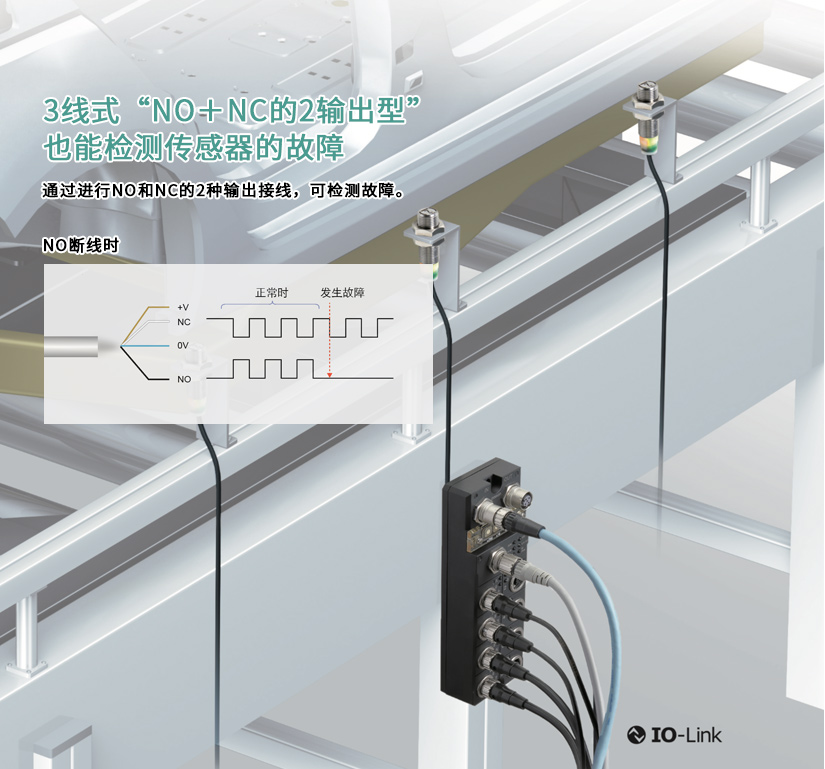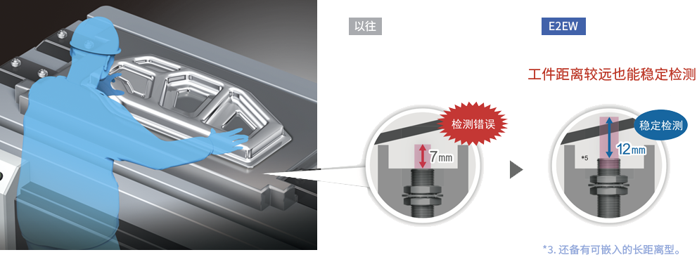过去,为了防止检测错误,只能采取有接触风险的传感器安装设计,E2EW则拥有超长检测的检测距离,即使隔开一定距离也不会发生检测错误,从而实现减少了接触风险的有余量的安装设计。