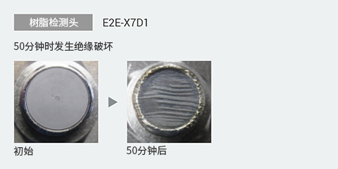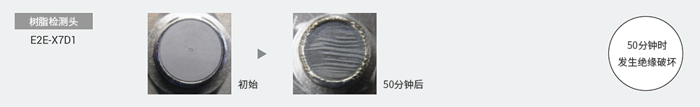 以130rpm的转速用不锈钢刷进行耐磨损性测试的结果显示,树脂检测头在50分钟后发生绝缘破坏,而金属检测头在400分钟后也未发生绝缘破坏。