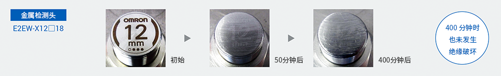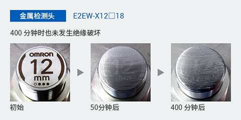 *12.以焊装生产线(25万台的规模)上的1,000台进行估算(每个夹具20台×50个夹具)。E2EW系列从耐冲击(*Y)和耐飞溅(*Z)的角度来看,10年无需更换。(*Y)本公司设想的“在焊装夹具上安装了工件的环境下,每天运行10小时,工件以相当于本公司连续打击测试的强度,每天碰撞接近传感器100次”条件下的假设值。由于本公司产品经过20万次的连续打击测试后仍未穿透,因此10年以上无需更换。(*Z)本公司设想的“工件焊装环境下1天运行10小时,清扫频率为每月1次(1年12次)”条件下的假定值。本公司以往产品(E2EF-Q)每清扫3次需更换1次,E2EW-Q每清扫180次需更换1次,所以10年以上无需更换。