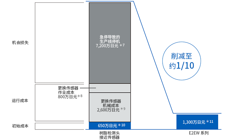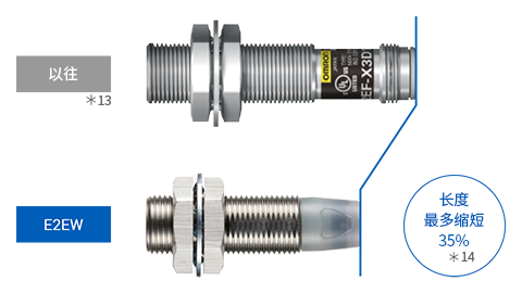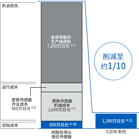 E2EW的“直流2线式基本机型”凭借优异的牢固性和耐环境性,不仅能消除更换传感器的机械成本和作业成本,而且能减少因传感器故障导致生产线停机造成的机会损失 *12,从而大幅改善总体拥有成本。