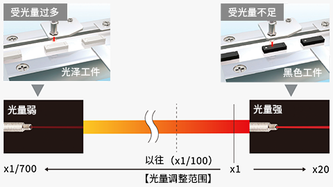 具有高动态范围(E3X-HD的7倍),从黑色物体到有光泽的物体均可稳定检测。即使背景为光泽面,通过充分降低光量,也不会发生光量饱和。