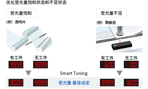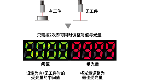 只需按下两次按钮,即可将光量和阈值调整到最佳条件。统一设定方法,不受检测物及安装条件影响。避免因操作人员不同产生的差异。