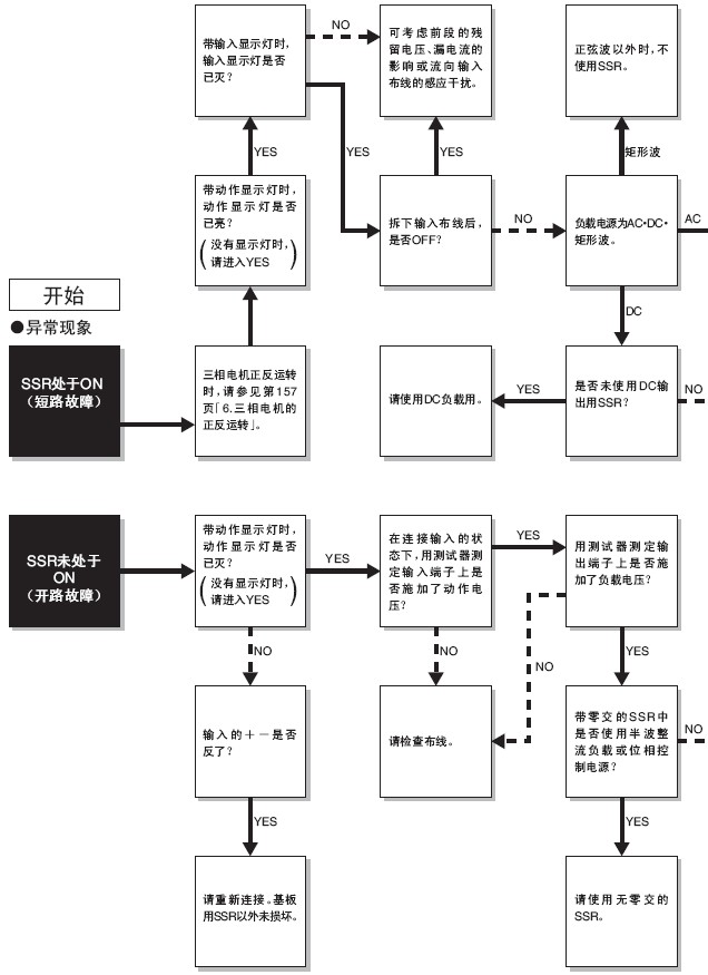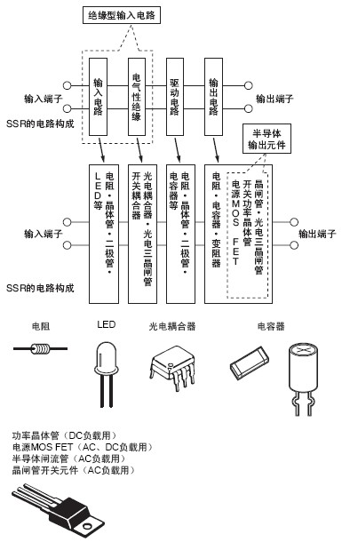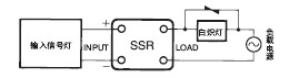 所谓SSR, 是固态继电器(Solid State Relay) 的简称, 是无可动 接点部分的继电器(无接点继电器)。在动作上与有接点继电器 相同, 但是该继电器使用半导体闸流管、晶闸管开关元件、二极 管、晶体管等半导体开关元件。另外也使用名为光电耦合器的光 半导体, 使其输入输出绝缘。光电耦合器的特点是用光的信号在 绝缘空间中进行传送, 所以绝缘性更好, 传送速度也更快。