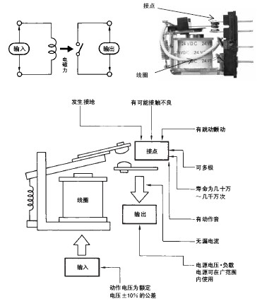 向线圈施加输入电压, 使其发生电磁力, 移动可动铁片, 从而切 换接点。不仅可在控制柜上使用, 还可用于其他范围。而且原理 简单可低成本加工。
