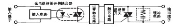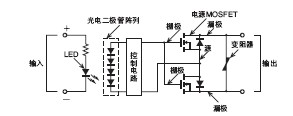 MOS FET继电器是在输出元件中使用功率MOS FET的SSR。为使 功率MOS FET动作, 光电二极管阵列作为受光元件使用。输入端 子中有电流流过时, LED会发光。这个光使光电二极管阵列中发 生光电流, 这使栅极电压使功率MOS FET置于ON。用源共通连 接2个功率MOS FET, 可控制AC负载。DC专用的类型中有带1个 电源 MOS FET的类型。