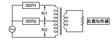 下图中,电源电压200V, N1=100次、N2=100次,若SSR2置于 ON, 则会在SSR1两端施加电源电压2倍的电压400V, 因此, 对 于SSR1, 务必使用400V的SSR。