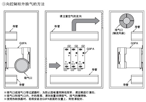 若为密闭柜, 则SSR所产生的热积聚在内部, 由于SSR的通电能 力降低, 还会对其他的电子设备产生不好的影响。使用时请务必 在柜的上部和下部设置通风用的孔。以下以G3PA的推荐例进行说 明。下述示例仅为标准, 最终使用时请执行④项的「设置后的确 认」。