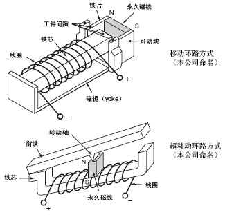 铁芯、磁轭、铁片的材料为半硬质磁性材料, 有两个以上操作线圈。
