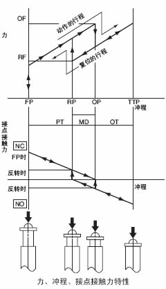 利用这一动作原理, 微动开关以开关固有的切换速度(离开速度) 切换接点, 而与按住拉力弹簧时产生外力的速度无关。F0=0时的位置称为动作位置,与拉力弹簧的一部分通过死点的位置基
