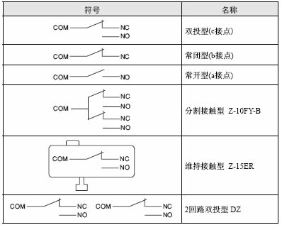 微动开关: 具有微小接点间隔和快动机构, 用规定的行程和规定的力进行开关动作的接点结构, 用外壳覆盖, 其外部有驱动杆的一种开关。(以下称开关)有接点 :在开关类型中, 和具有开关特性的半导体开关相比, 通过接点的机械开关来实现开关的功能。接触形式 :根据各种用途构成接点的电气输入输出电路[(16)中显示]。
