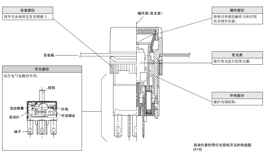 下图显示了一种代表性带灯式按钮开关的结构。带灯式按钮开关大体由5个部分组成。