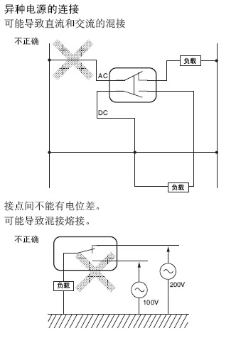 ·绝对不要使用超过开关的开闭容量等接点额定值的负载。这样不仅会导致绝缘不良、接点熔接、