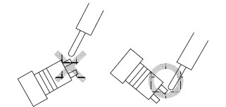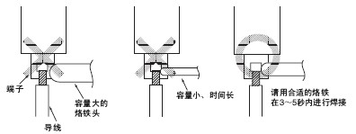 ·为防止焊锡流入开关内部,端子被焊锅覆盖的部分和外壳面之间应空开1mm以上。