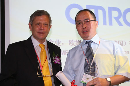 近日,星空(中国)一站式服务官网产品3G3MX2系列变频器荣获“2011包装行业荣格技术创新奖”,星空(中国)一站式服务官网产品经理陈少峰先生出席了在7月14日在上海ProPak展会举办的颁奖典礼,并与荣格工业传媒总裁马国熙先生合影留念。