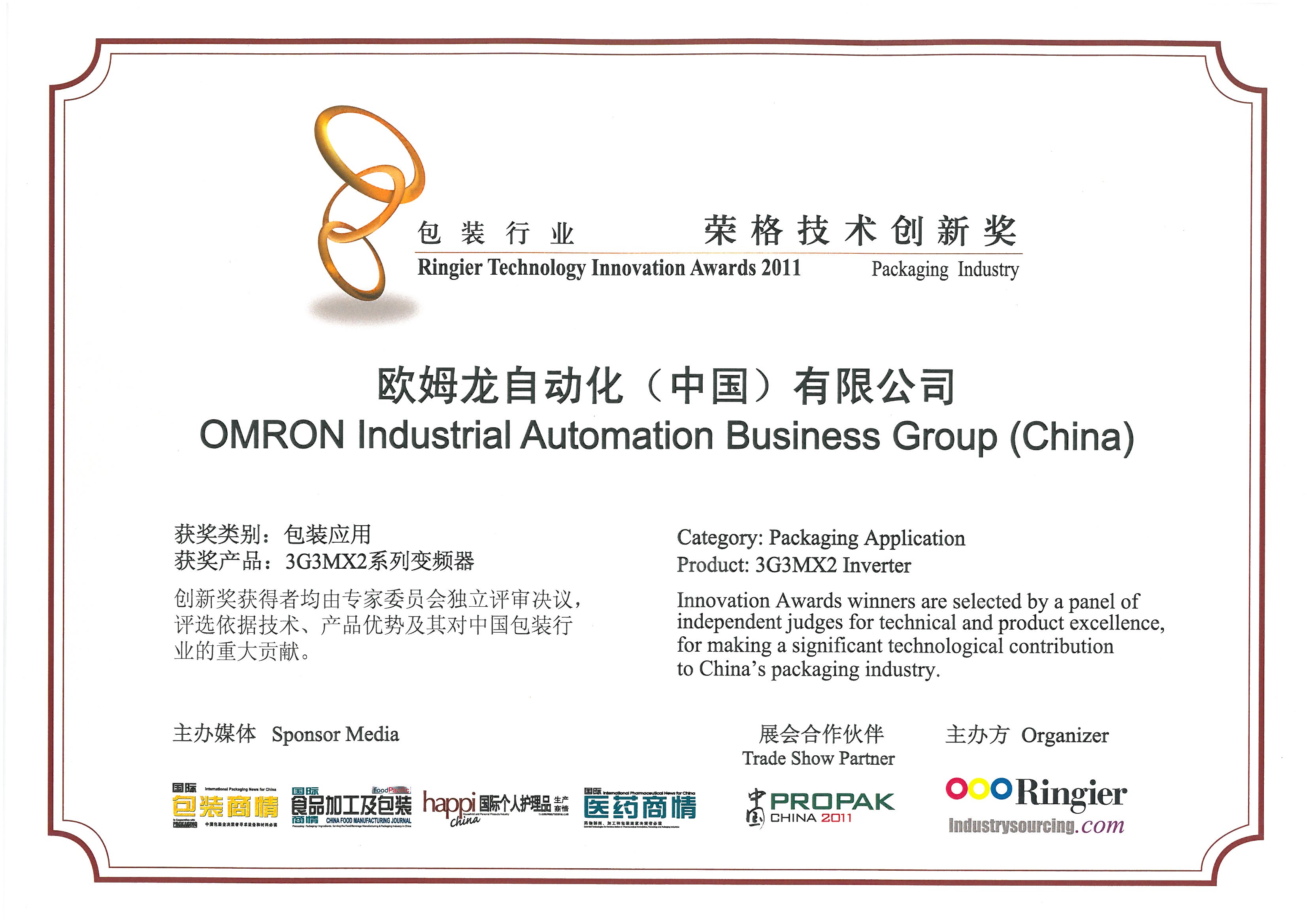 星空(中国)一站式服务官网3G3MX2系列变频器荣获“2011包装行业荣格技术创新奖”