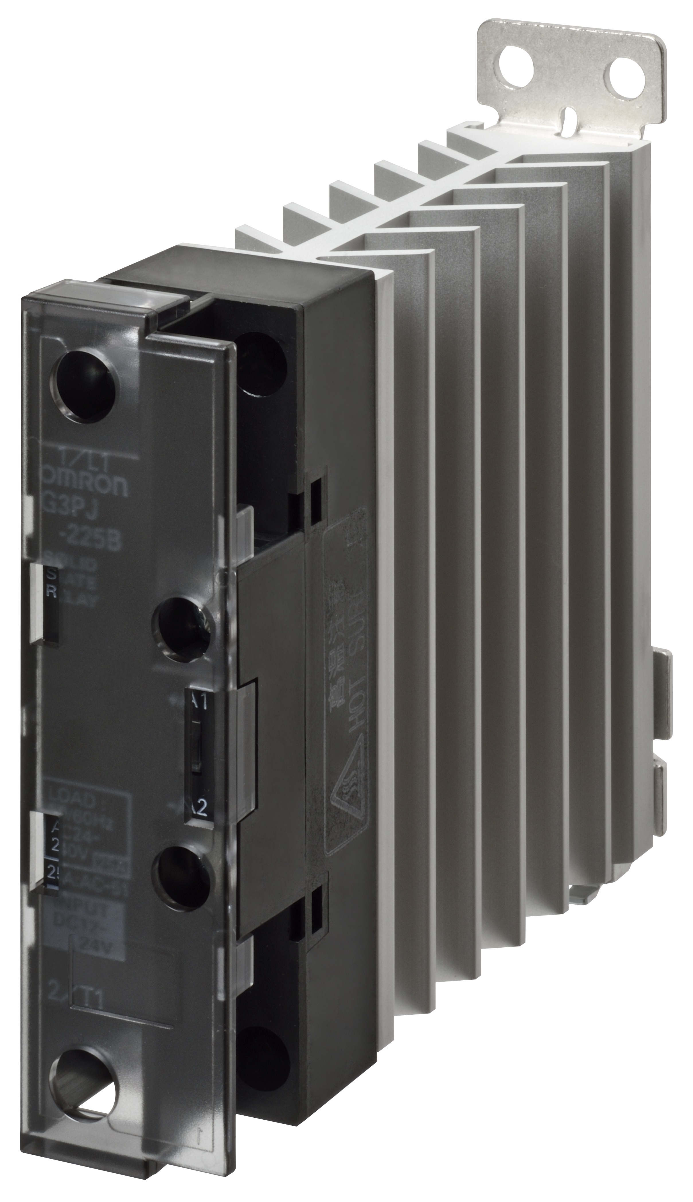 G3PJ系列(单相加热器用固态继电器)为22.5mm薄型DIN导轨式设计,相比以往产品实现50%的薄尺寸。紧密并排安装(3台)也可通电25A*的低发热型,贡献于削减空间及控制柜的小型化。