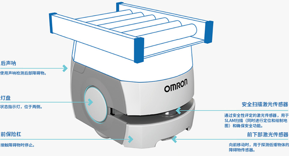 移动机器人设计用于满足行业的新要求, 可与人互动,以打造一个安全的协同工作环 境。安全激光传感器和声呐有助于机器人探 测其路径中的障碍物,从而避免碰撞。