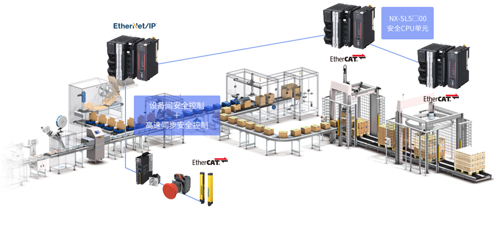 全世界首次 * 将最适用于生产线和机器安全控制的两个不同的开放网络整合起来。生产线可利用EtherNet/IP TM 实现扩展性出众的安全控制,设备内可利用EtherCAT ® 实现高速的安全控制。此外,即使是需要高速的生产线,也可同时实现机器控制和安全控制。由此可实现机器的标准化,灵活地构建生产线。