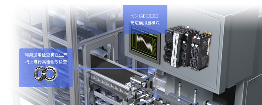如果是对高速性有要求的检查,经常会使用PC搭载专用检查机。这种情况下,由于保养需要特殊的技能,同时考虑到生产线停机的风险,通常在生产线外进行抽样检查。采用NX1+高速模拟量模块,可按5μs固定周期采集测量数据,不需要PC搭载专用机。同时,NX1为通用控制器,可在当地进行保养。因此,可轻松实现在线化检查和全数检查。