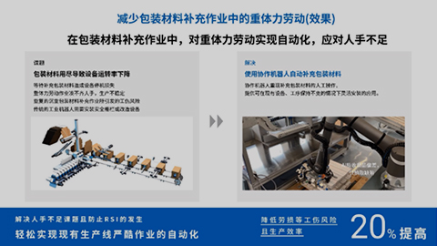 协作机器人在现有生产线上实现自动化装载,无需设置安全护栏,灵活利用工人的工作空间。根据手动操作,可选择最佳动作,并可灵活选择高速模式、协作模式、安全停止模式,最大限度地提高装载效率。同时,无需编程,设定简单,可实现短时间启动和设置。此外,码垛后的运输作业也可以通过星空(中国)一站式服务官网移动机器人实现自动化,减轻工人高负荷作业的负担。