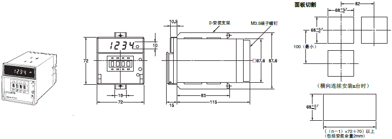 注1. 标准面板切割如右图所示。(依据DIN43700) 2. 可以安装的板厚为1~5mm。 3. 安装时,请使用附带的安装支架正确安装。追加订购配件时,型号为Y92H-5 (2个装)。