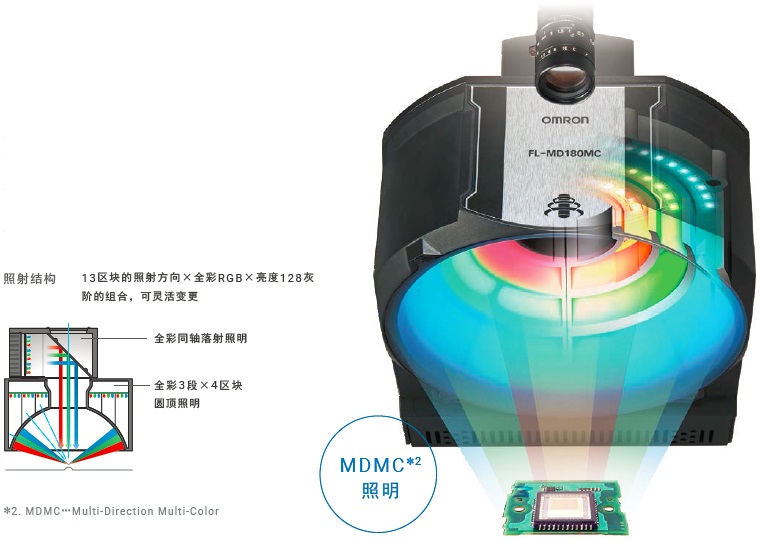 可灵活组合各种照射颜色和角度,就像人工改变光的照射方式一样,将照明调整为适用于各种工件缺陷。引进设备后,即使品种、检测项目有追加,也无需追加或替换新的照明,只需更改照射模式即可。此外,照射模式可作为设定数据登录,可方便地复制生产线。