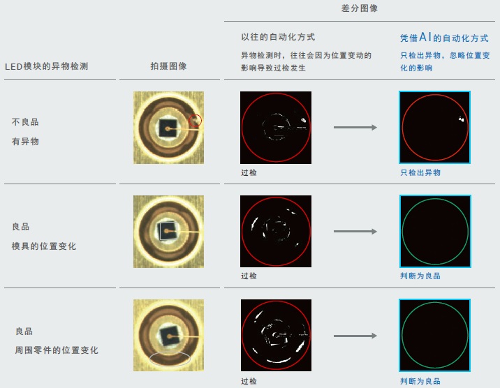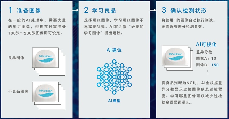 “AI准确匹配”通过学习良品状态的图像数据,在短时间获得检测人员在多年实践中积累的“检测技术和知识”。除了能够再现熟练工的检测能力外,自动化还能降低成本、提高生产效率。
