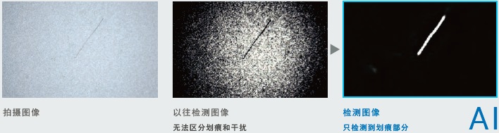 一种图像处理过滤器,预先学习了“人感觉是划痕的图像的特征”。即使没有定义划痕,例如用传统方法很难自动化的“不可预测的尺寸、形状、颜色”等,AI也能判断并抽取划痕的特征。