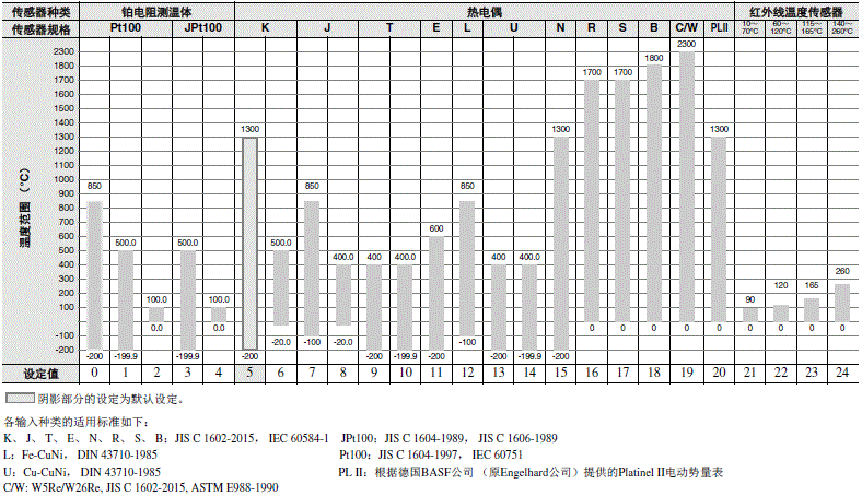 热电偶:K、J、T、E、L、U、N、R、S、B、C/W或PL II 铂电阻测温体:Pt100或JPt100 红外线温度传感器(ES1B): 10~70°C、60~120°C、115~165°C或140~260°C 模拟量输入 电流输入:4~20mA或0~20mA 电压输入:1~5V、0~5V或0~10V |