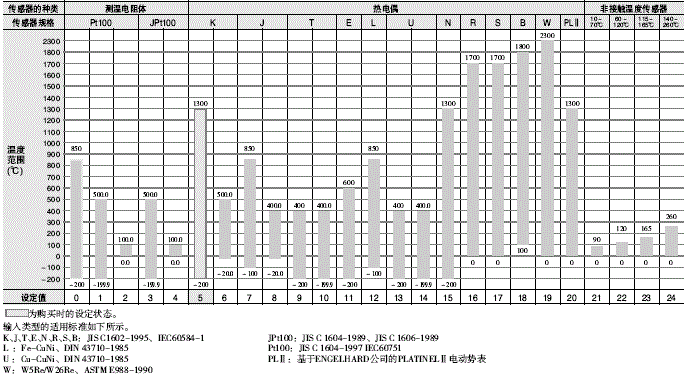 热电偶:K、J、T、E、L、U、N、R、S、B、W、PLⅡ 铂电阻测温体:Pt100、JPt100 非接触温度传感器(ES1B):10~70℃、60~120℃、115~165℃、140~260℃ 模拟量输入 电流输入: 4~20mA、0~20mA 电压输入: 1~5V、0~5V、0~10V |