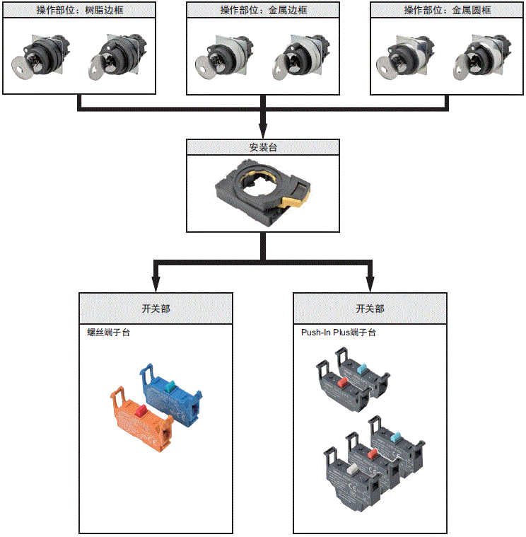 操作部位、LED灯、安装台、开关部可以单独订购。如果需要购买成套组合型号中不提供的单元,可将这些部件单独订购 后组装使用。也可将其作为维护部件库存。