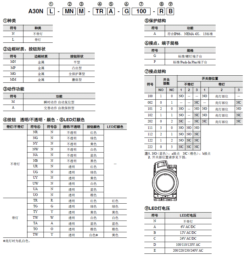 | 带灯 | 透明 | 红色 | A30NZ-MGM-TRA | A30NZ-MGA-TRA | A30NZ-MMM-TRA | A30NZ-MMA-TRA |