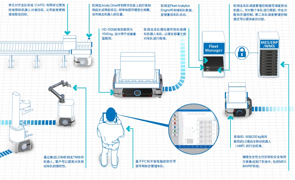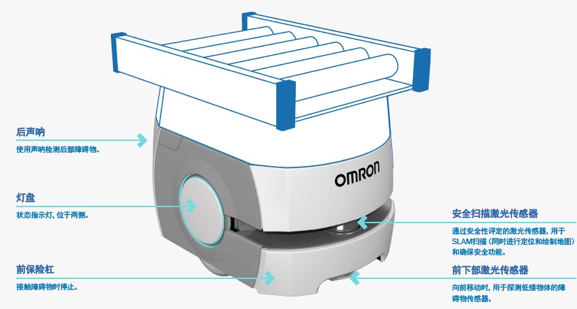移动机器人设计用于满足行业的新要求,可与人互动,以打造一个安全的协同工作环境。安全 激光传感器和声呐有助于机器人探测其路径中的障碍物,从而避免碰撞。