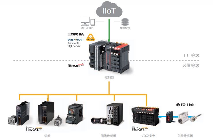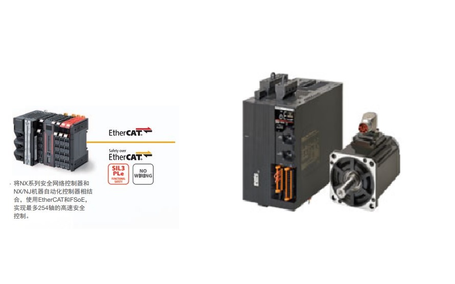 将NX系列安全网络控制器和NX/NJ系列机器自动化控制器连接后,可同时使用 EtherNet/IP+CIP Safety和EtherCAT+FSoE。