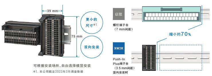 更小尺寸*1的连接器端子台有助于丰富控制柜功能和实现控制柜小型化。