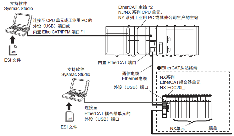 *1. Sysmac Studio的连接方法取决于CPU单元和工业用PC的型号。 *2. EtherCAT从站终端无法连接本公司的具备EtherCAT主站功能的位置控制单元(CJ1W-NC□81/NC□82)。 注. 如需了解是否可将NX单元连接至使用的CPU单元或通信耦合器单元,请参见使用的CPU单元或通信耦合器单元的用户手册。