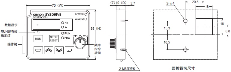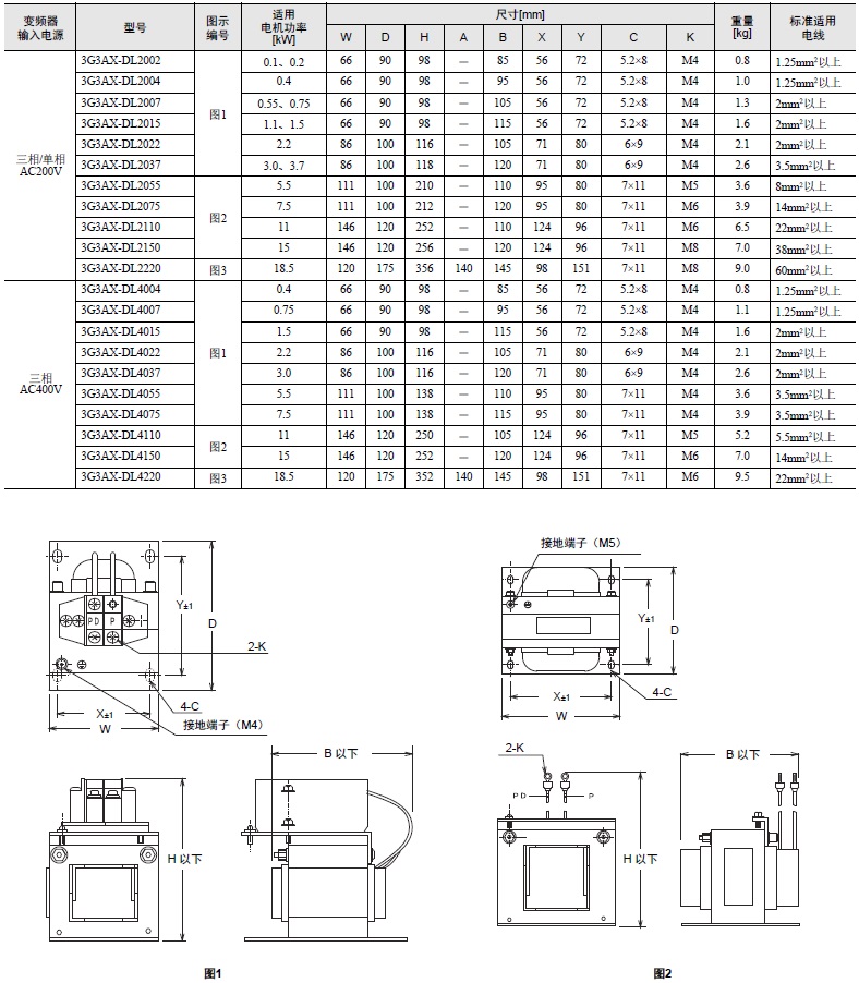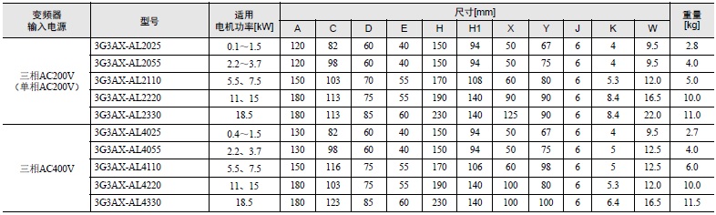 (变频器本体的D尺寸因功率而异。详情,请参见《MX2系列V2型多功能型小型变频器用户手册》。)