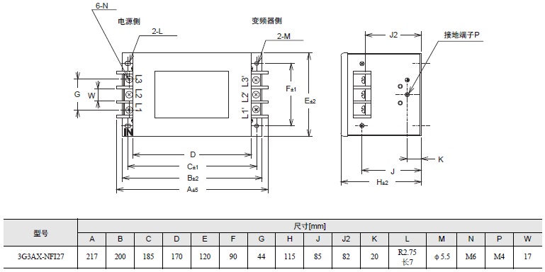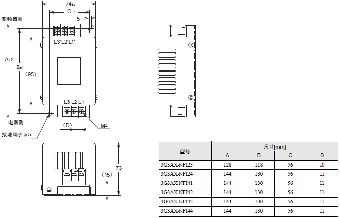 *1. 安装EtherCAT通信单元时的整体进深尺寸,请在变频器本体的D尺寸上增加34mm。