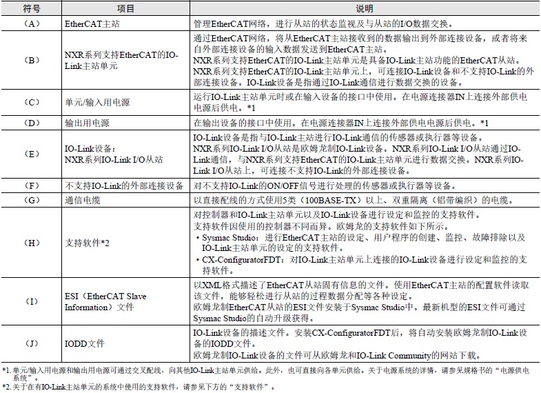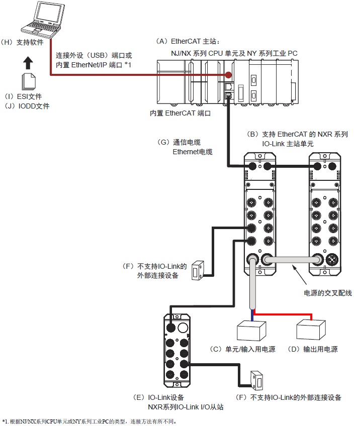 NXR系列支持EtherCAT的IO-Link主站单元的系统构成示例如下。 在此,以使用NJ/NX系列CPU单元及NY系列工业PC为示例进行说明。