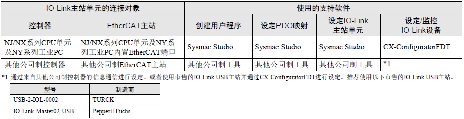 在NXR系列支持EtherCAT的IO-Link主站单元的系统构成中,可使用的支持软件如下所示。 使用的支持软件取决于目标系统的范围。 关于支持软件的版本,请参见“额定值 / 性能”中的“版本相关信息”。