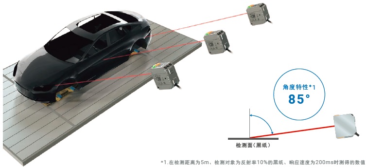 检测夹具中车身面板上的孔和销,以判别车型并检测有无部件。由于具有理想的角度特性,可安装在人和机器人的作业动线之外。