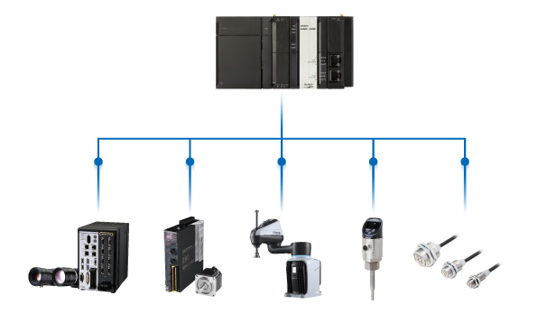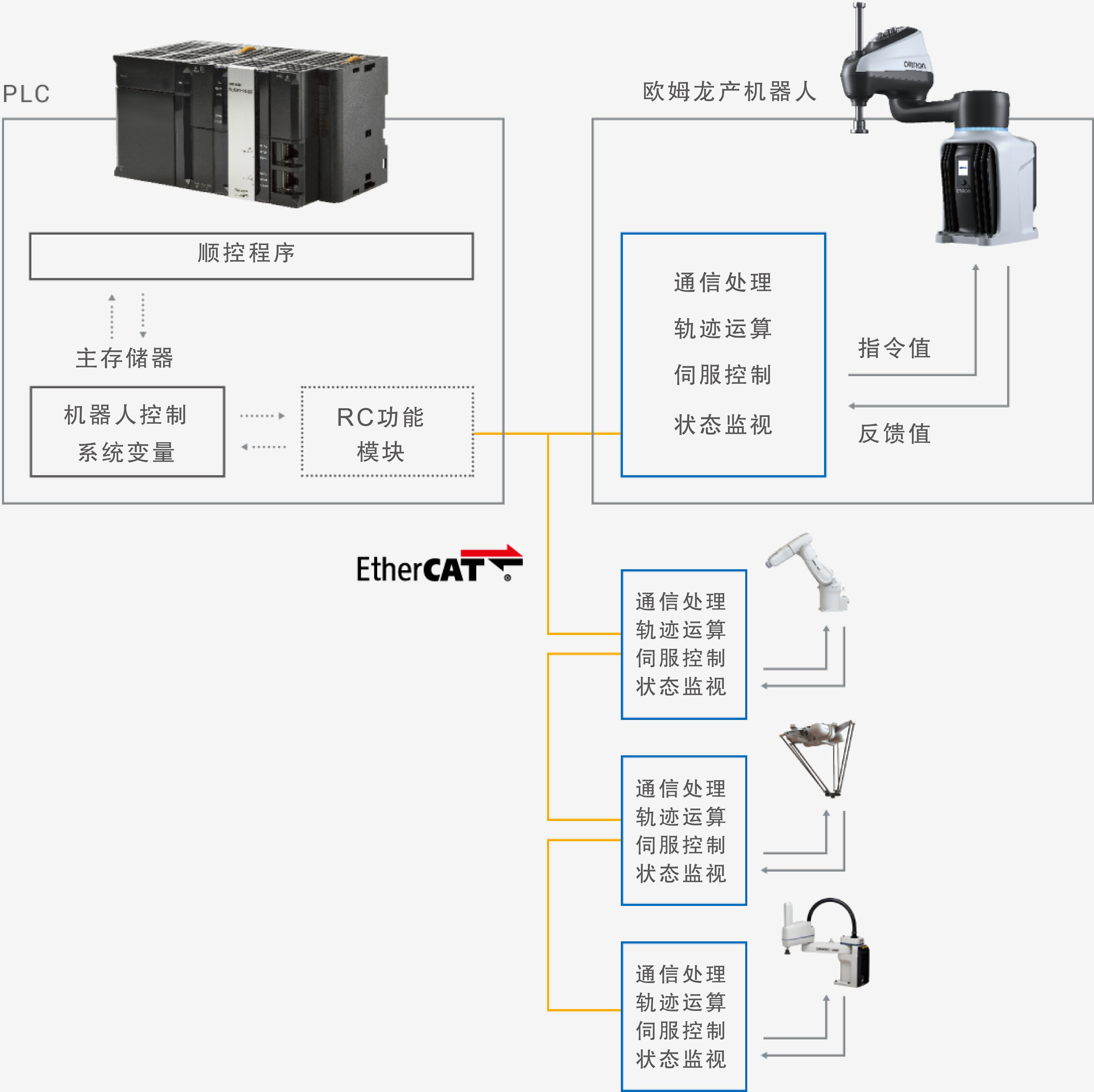 将机器人控制统合至PLC,在保持机器人自身的高速性、高精度的同时,可以与其他设备一样使用PLC,通过EtherCAT对机器人进行控制,PLC工程师也能控制机器人。