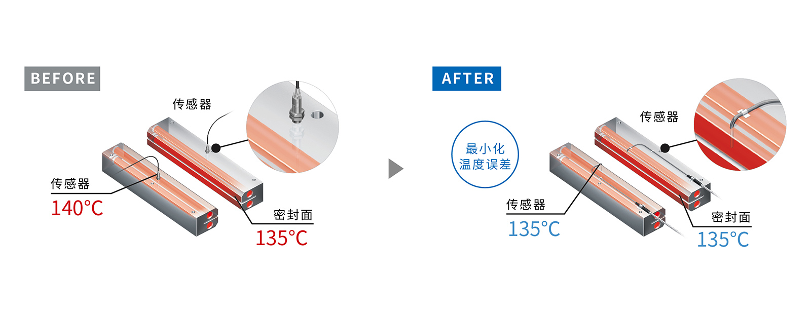 拥有包装机专用,测量密封面温度的“包装机用温度传感器”。 不受包装机速度和包装材料变化等温度波动因素影响,可准确测量加热棒表面的温度。