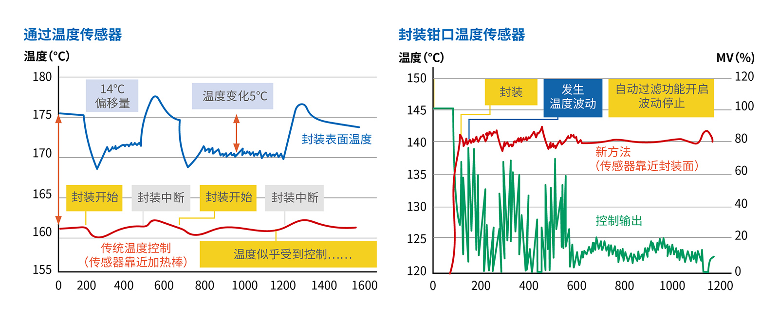 通过使用包装机用温度传感器和自动过滤调整功能,可在根据密封温度管理质量的同时,仅靠温控器抑制温度波动,无需人为调整。