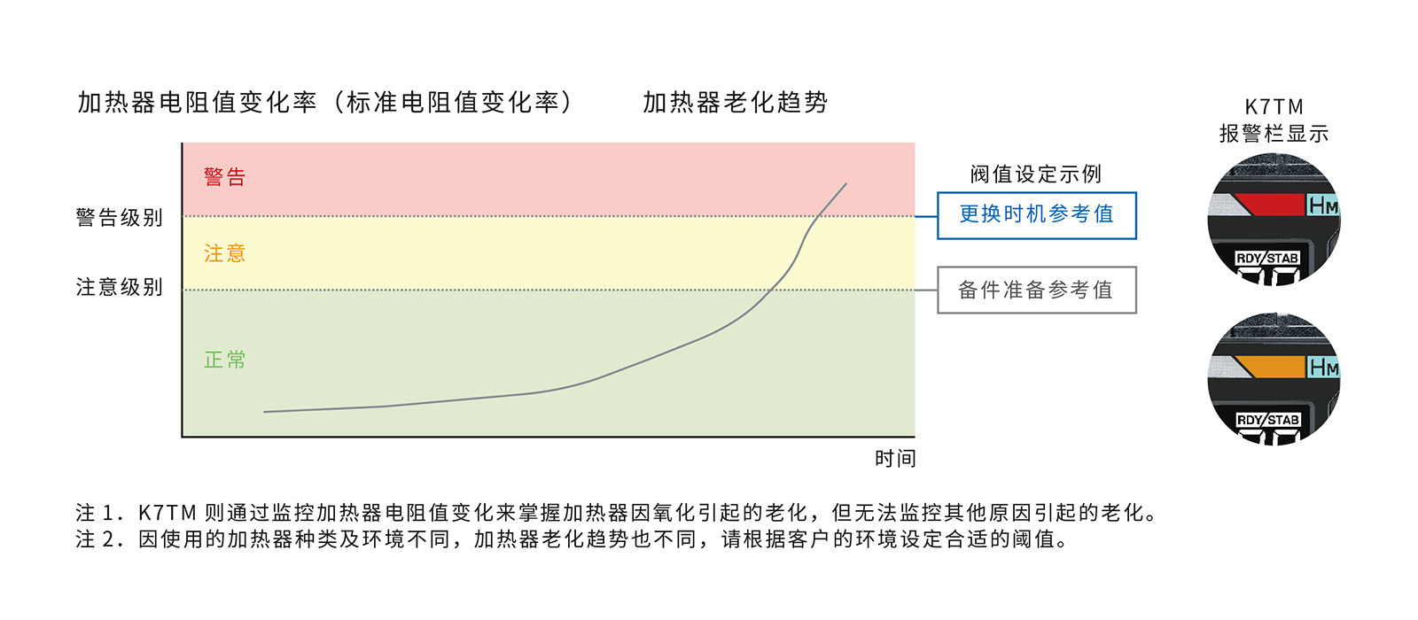 通过电阻值变化率捕捉老化趋势,并依据加热器断线风险增大的变化率状态设定阈值,无需依赖个人经验。