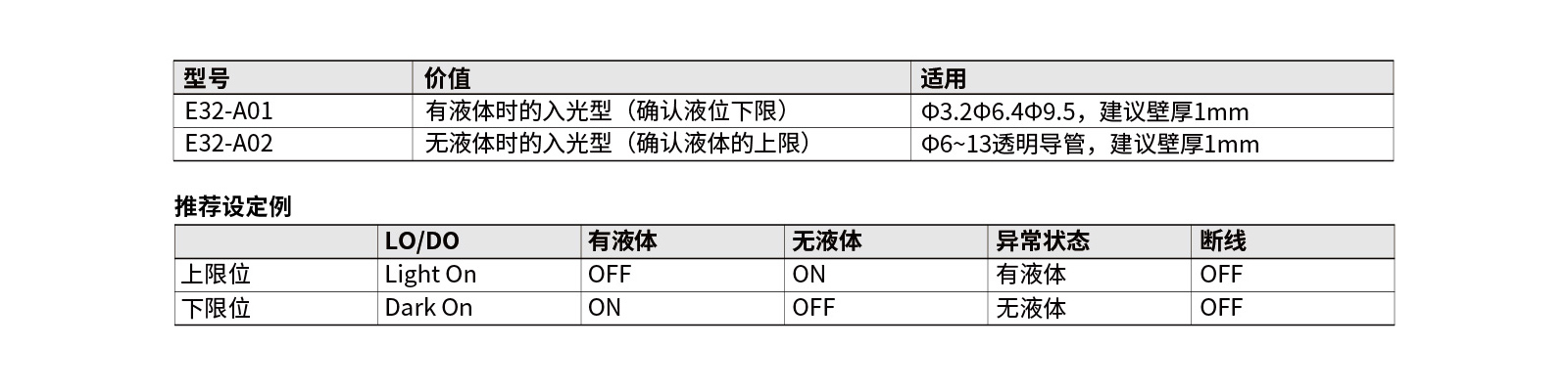 考虑到断线时的安全,备有有液体状态(A01)和无液体状态(A02)下的入光两种类型。