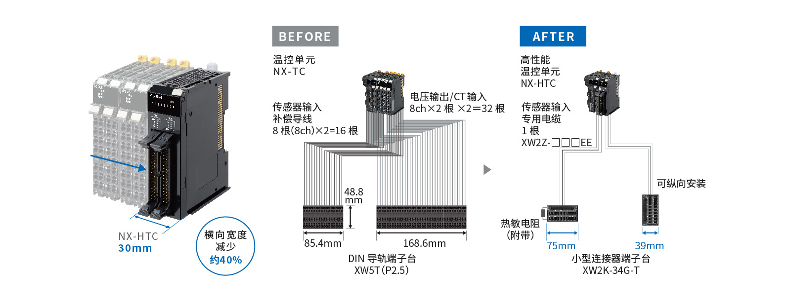 每台单元支持8Ch控制,仅30mm宽度,大大节省面积。同时搭配小型连接器端子台XW2K,进一步节省空间。
