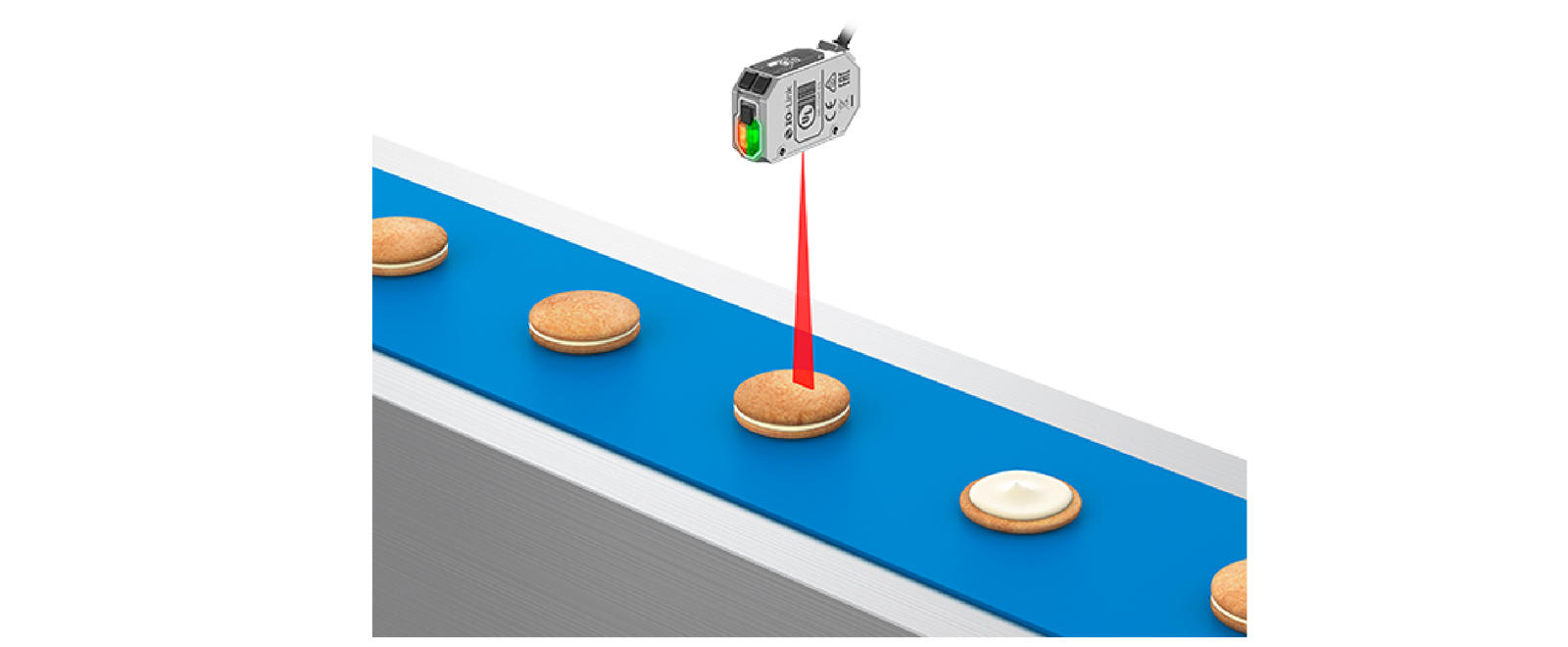 E3AS-HL150L采用高精度CMOS感光元件,实现分辨率为0.1mm,理论精度高,通过距离清晰分辨饼干、夹心的厚度,准确判断饼干是否缺片或缺少夹心等不良情况。